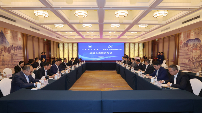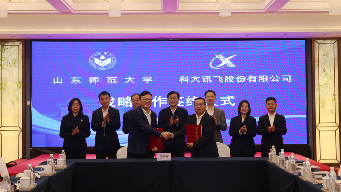 4月9日,山东师范大学与科大讯飞股份有限公司战略合作签约仪式在千佛山校区举行。山东省委教育工委委员、省教育厅党组成员、副厅长王浩,山东师范大学党委书记冯继康、校长张建、副校长周珊珊,科大讯飞股份有限公司高级副总裁周佳峰、山东公司总经理柳升华出席仪式。仪式由校党委副书记许双庆主持。
