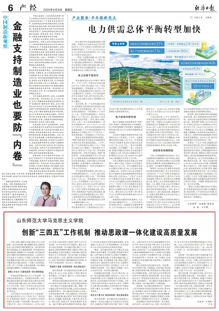 【编者按】8月8日,《经济日报》06版“产经”以“山东师范大学马克思主义学院:创新‘三四五’工作机制 推动思政课一体化建设高质量发展”为题,报道学校马克思主义学院针对思政课建设体制不顺、运行机制不畅、落地实效不强等突出问题,探索出“凝聚三方合力、贯通四个领域、抓住五个着力点”工作机制,为思政课一体化建设高质量发展提供了可借鉴的经验做法,推动新时代立德树人工程的山东实践不断走深走实。全文如下: