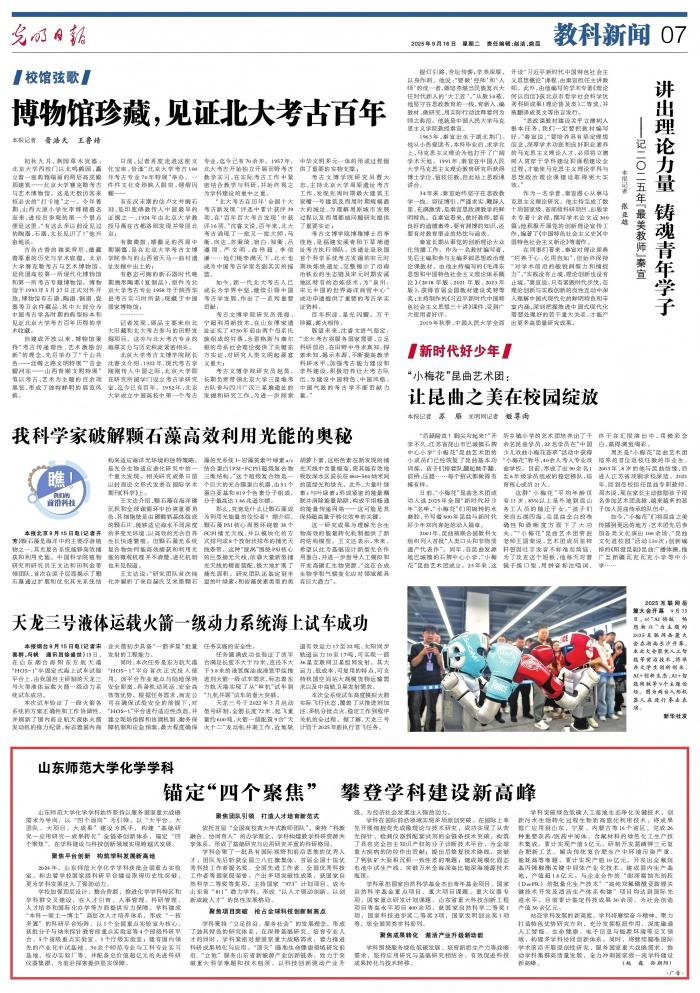 【编者按】9月16日,《光明日报》07版“教科新闻”以《山东师范大学化学学科锚定“四个聚焦” 攀登学科建设新高峰》为题,报道山东师范大学化学学科构建“基础研究—应用研究—成果转化”全链条创新体系,锚定“四个聚焦”,在学科建设与科技创新领域实现跨越式发展。全文如下: